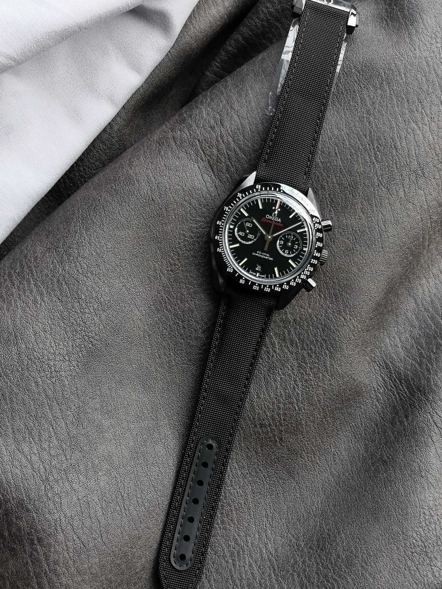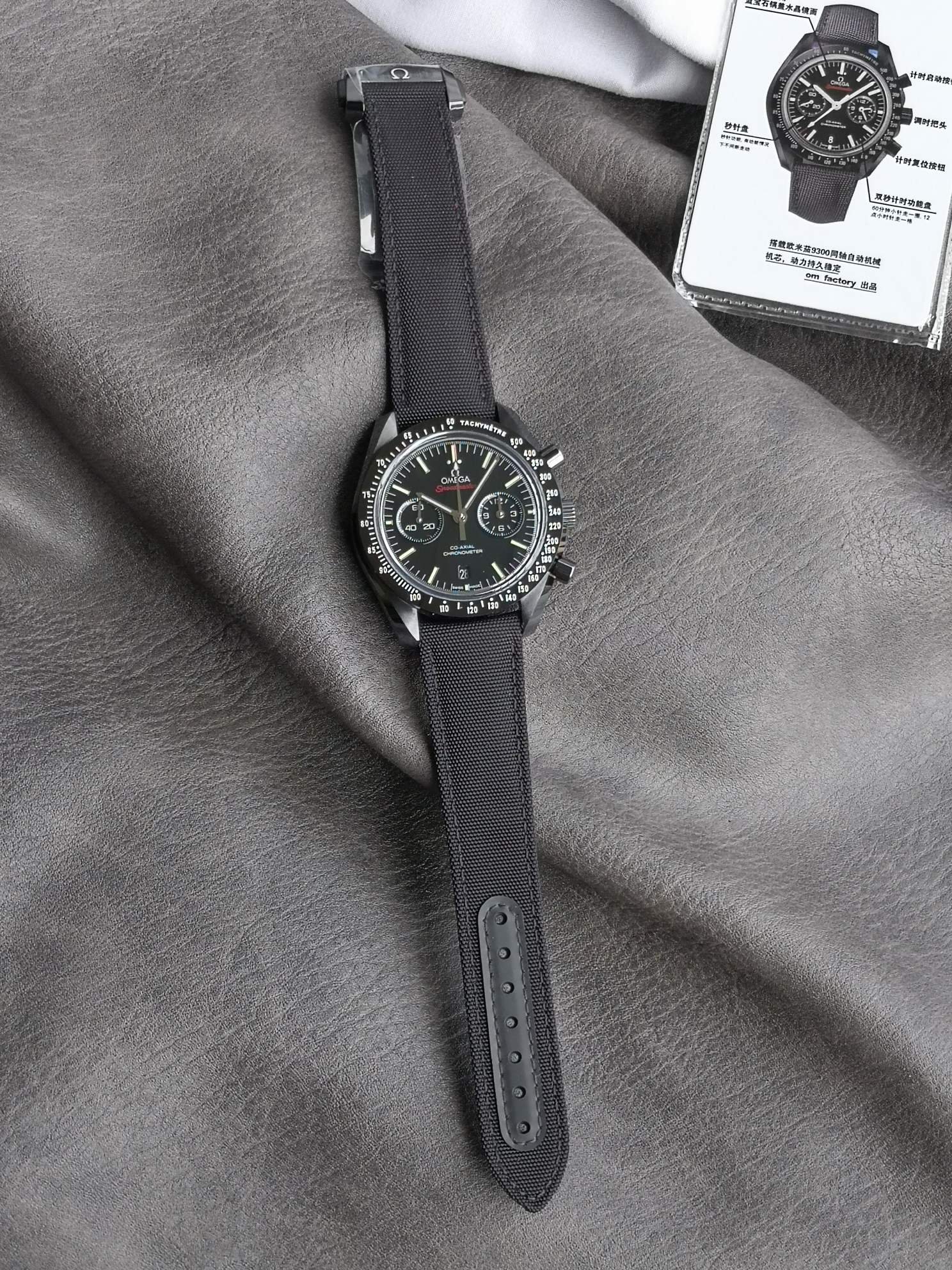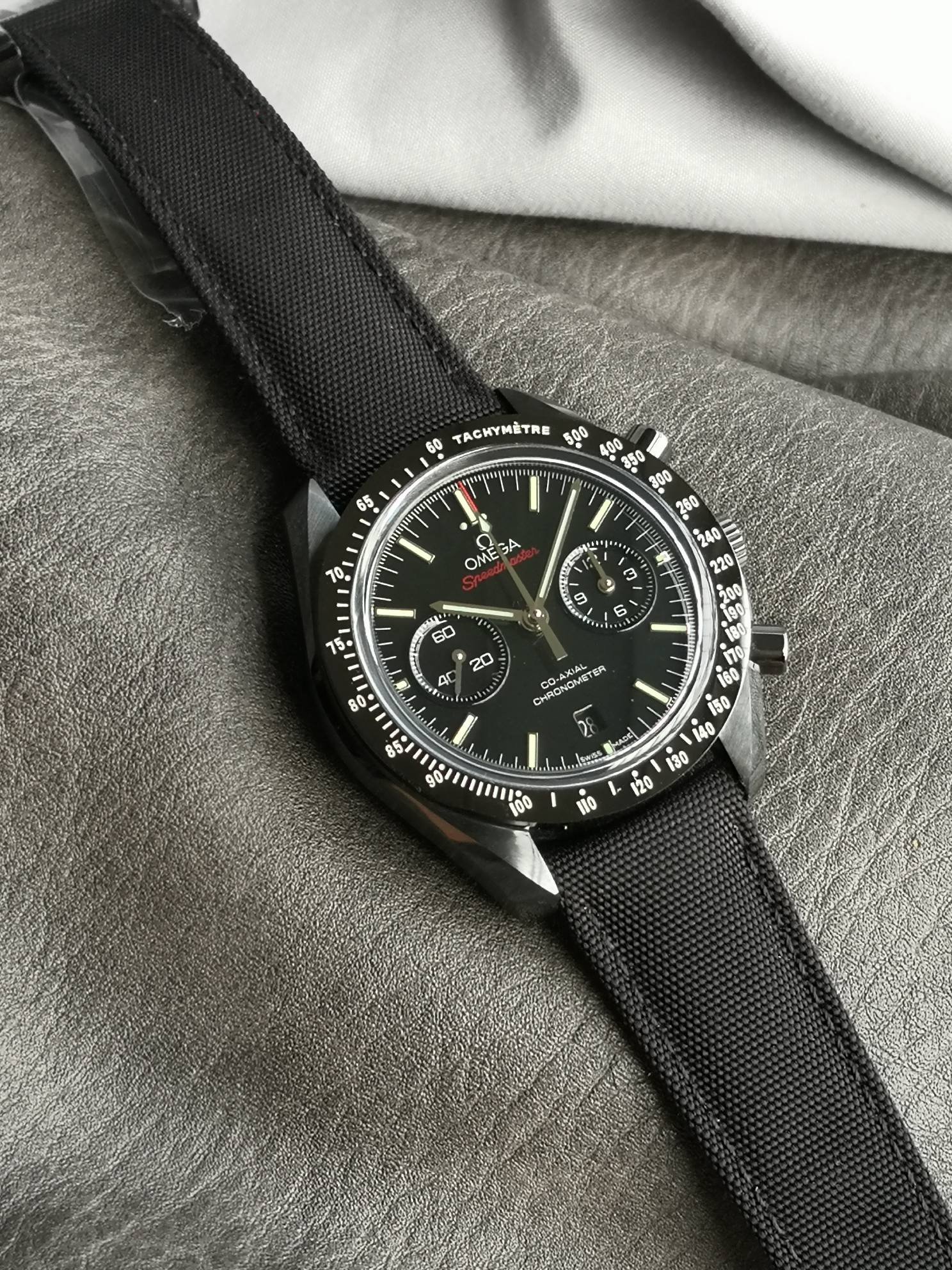 The Omega Speedmaster Moonwatch 311.92.44.51.01.003 features a ceramic case with a coated nylon strap, a black panda dial, and a zirconium oxide ceramic dial adorned with striking white 18K gold “Moonwatch” style hands. Two ceramic sub-dials are located at 3 o’clock and 9 o’clock. It is powered by the 9300 automatic mechanical chronograph movement and measures 44.25 mm in diameter.