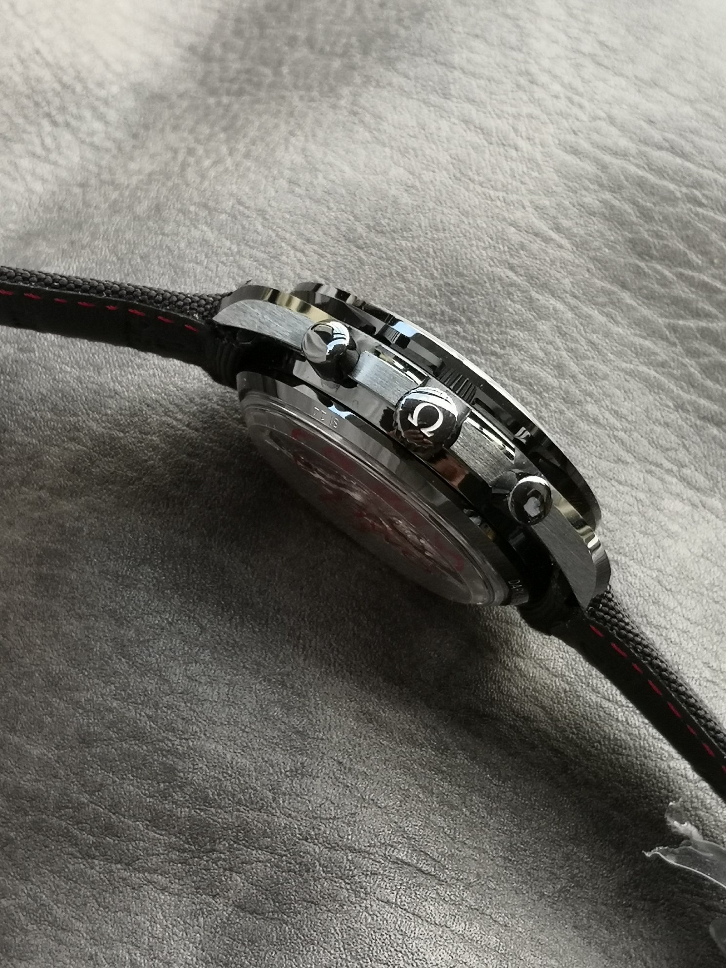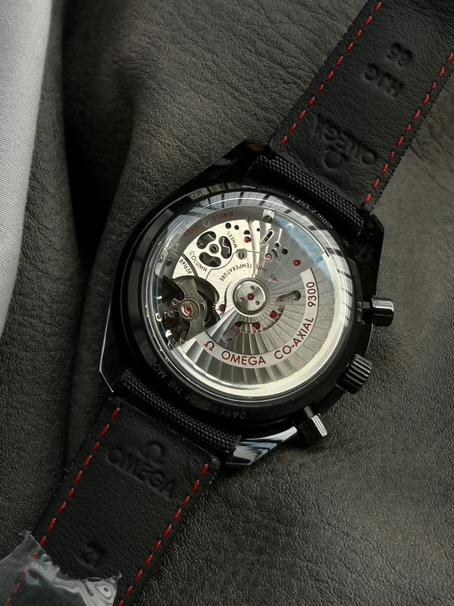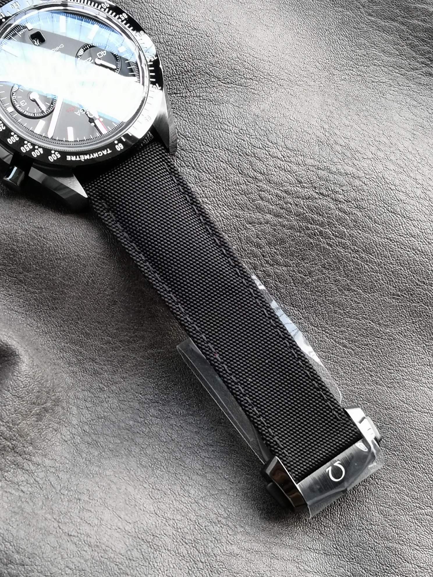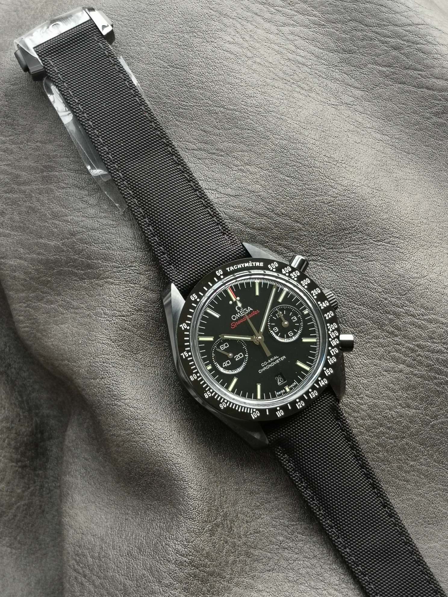 The Omega Speedmaster Moonwatch 311.92.44.51.01.003 features a ceramic case with a coated nylon strap, a black panda dial, and a zirconium oxide ceramic dial adorned with striking white 18K gold “Moonwatch” style hands. Two ceramic sub-dials are located at 3 o’clock and 9 o’clock. It is powered by the 9300 automatic mechanical chronograph movement and measures 44.25 mm in diameter.